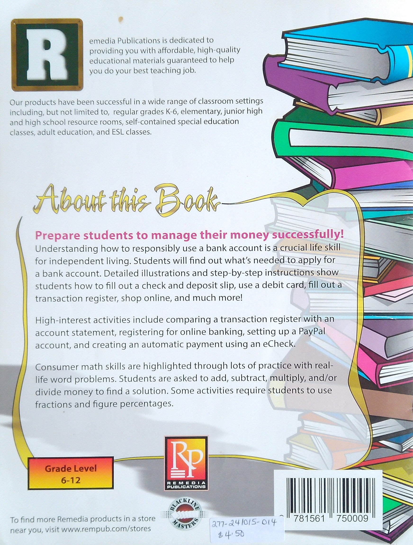 Practical activities that teach how to use a bank account, by Sue LaRoy. From Remedia Publications, for grades 6-12. Softcover, good condition; clean and unused.