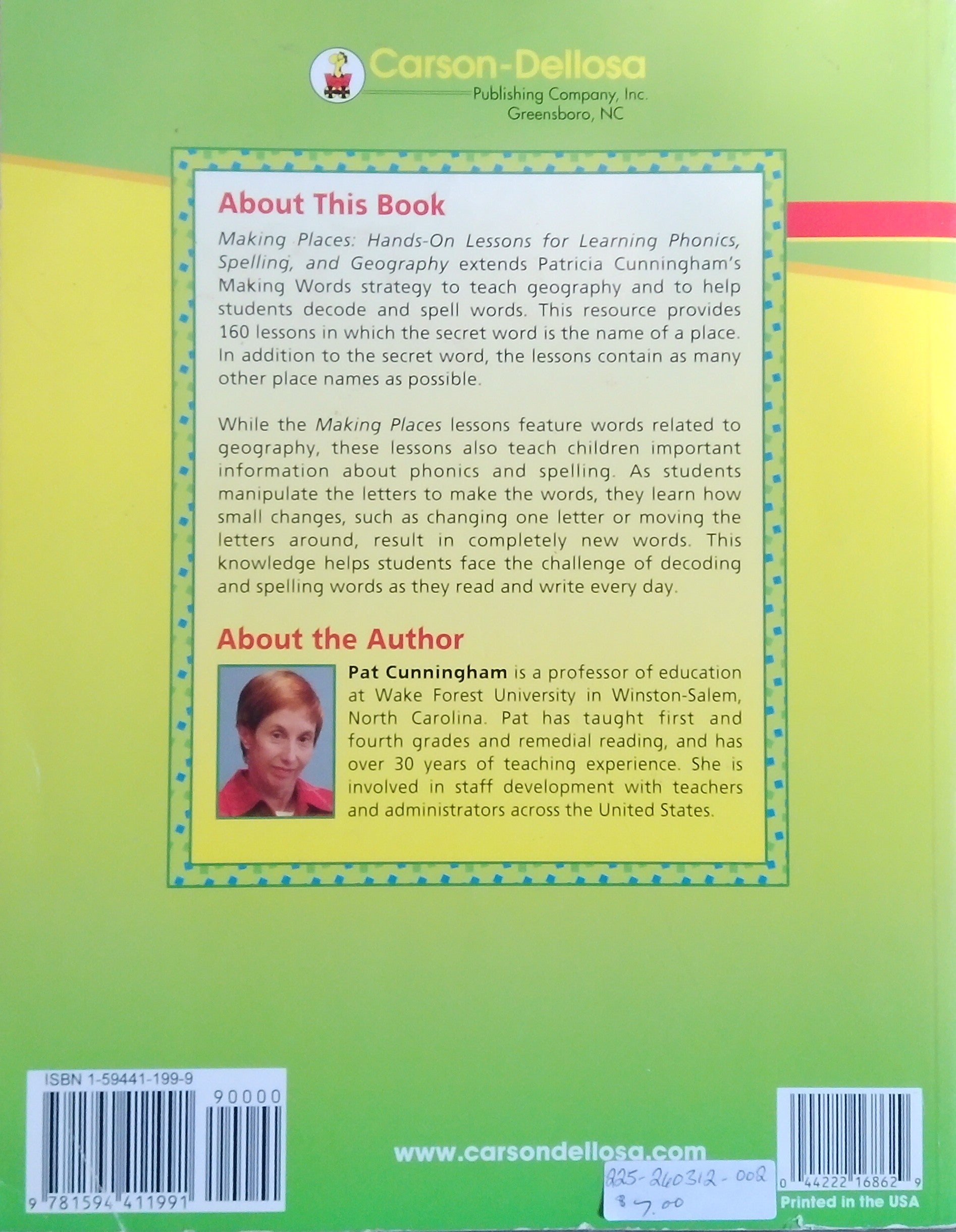 160 'making words' lessons using places, for grades 2-6. By Patricia M. Cunningham, from Carson-Dellosa. Softcover, very good condition; clean and unused.