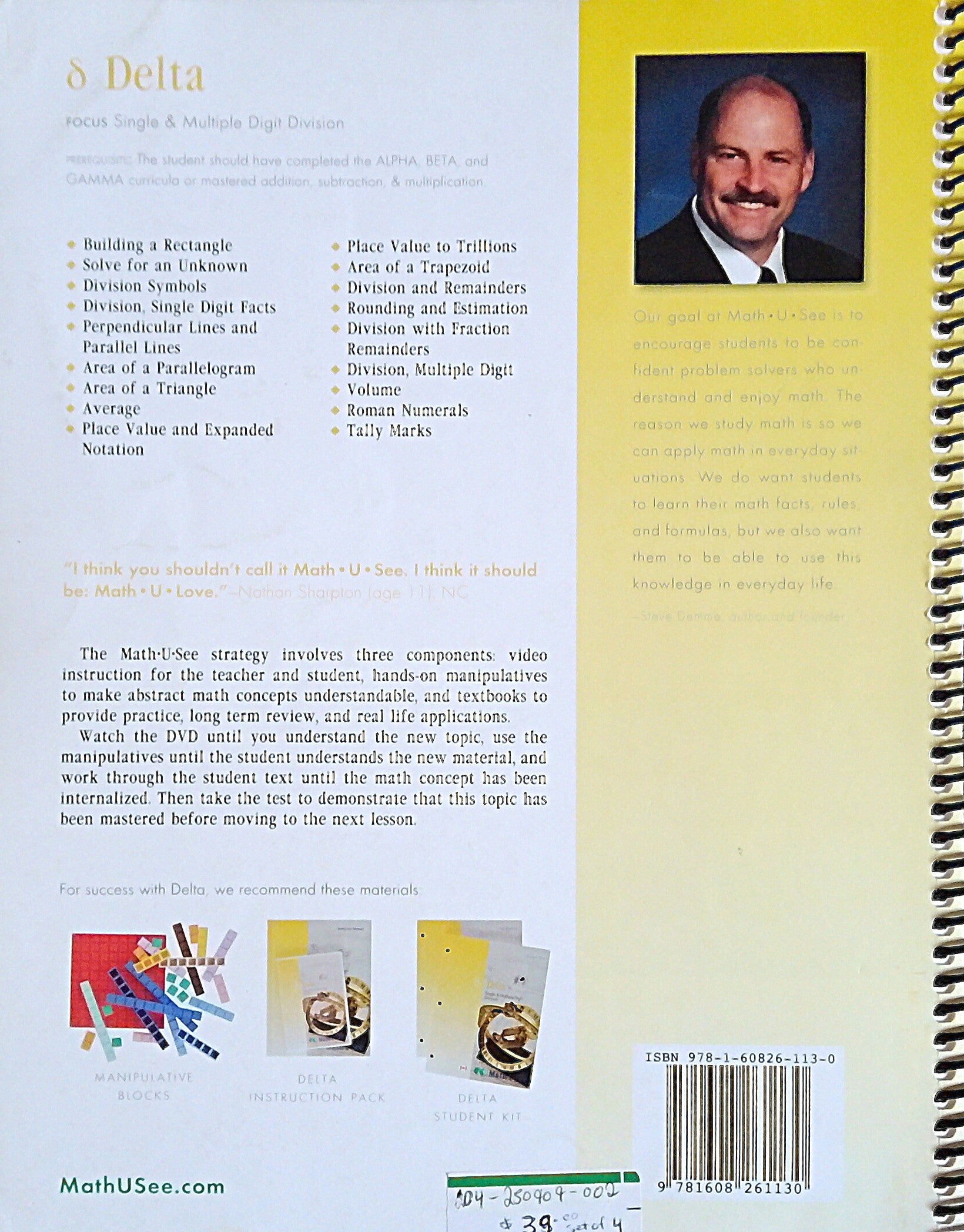 Part of the Math-U-See elementary series. Includes Delta DVD, Instruction Manual, Student Text and Test Booklet. Instruction Manual and Student Text are missing covers but are otherwise in good condition.