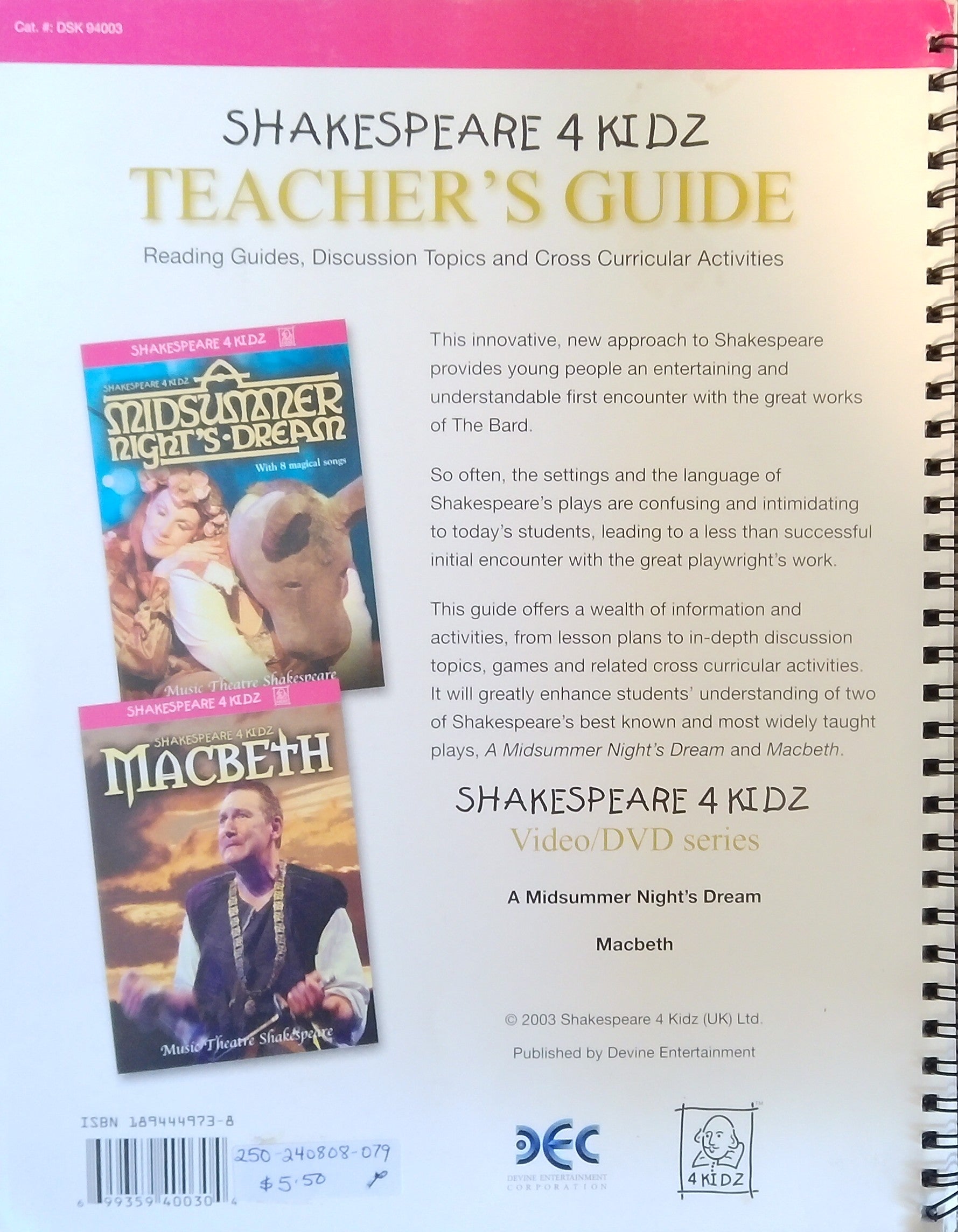 Reading guides, discussion topics, and cross curricular activities for Shakespeare 4Kidz, A Midsummer Night's Dream, and Macbeth. Spiral-bound, very good condition.
