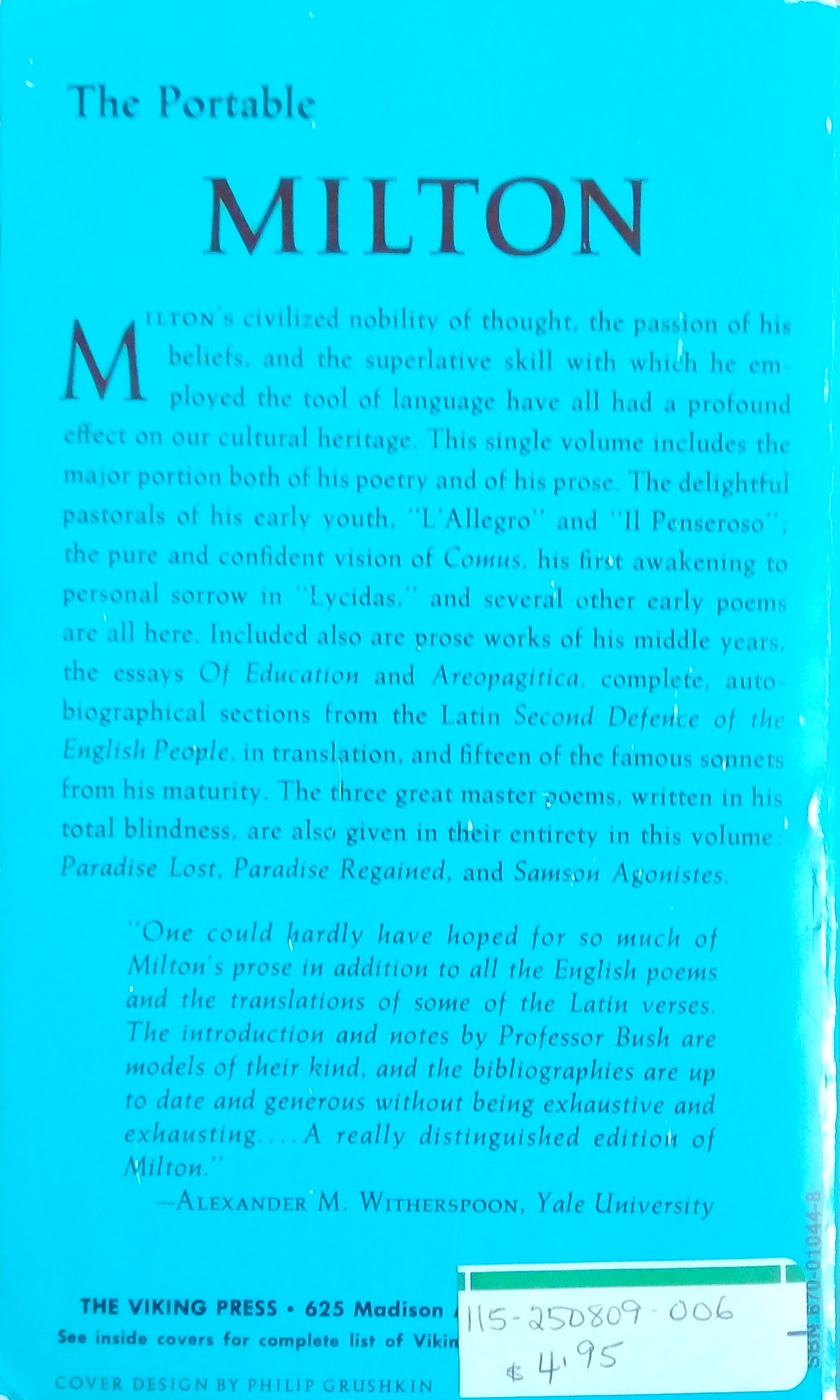 Five books in one; Paradise Lost, Paradise Regained, Samson Agonistes, Comus, and Areopagitica, all complete and unabridged, plus famous early poems and other prose works. With a revised bibliography and a foreword by Douglas Bush. Softcover, good condition.